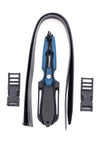 We used a specific grade of heat treated stainless steel, capable of cutting through stainless steel cable, monofilament, and dyneema lines. We used a full tang blade so that the knife has a good weight to it. The sheath was designed to lock the knife properly in place.