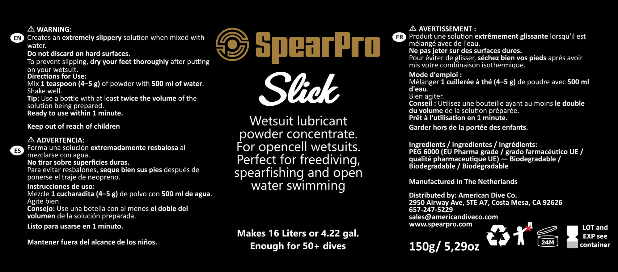 Made with pharmaceutical-grade PEG from Western Europe, SpearPro Slick is non-toxic, biodegradable, and free from microplastics—safe for both you and the environment. Keep it at home or in your dive bag for a reliable, repeatable solution that makes suiting up a pleasure, not a struggle.
